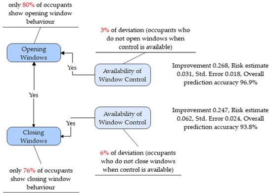 As seen in Figure 4, 80% of occupants responded that they open windows, while 76% responded to closing windows. Availability of window control is the main predictor of both opening and closing window behaviours. Most of the participants who had the window controls interacted with windows, while only 3% of occupants did not open windows, and 6% did not engage with closing windows, although the control was available. This is similar to the risk of misclassifying an occupant into these behaviours, and the prediction accuracy is consistent with the risk estimate. The overall prediction accuracy of models reached 96.9% for opening windows and 93.8% for closing windows. According to the current models, control availability is far more important than all the other predictors and improves the purity of all nodes with the most homogeneity. Similarly, Bavaresco et al. identified the availability of window control as the main predictor of adjusting windows [31].