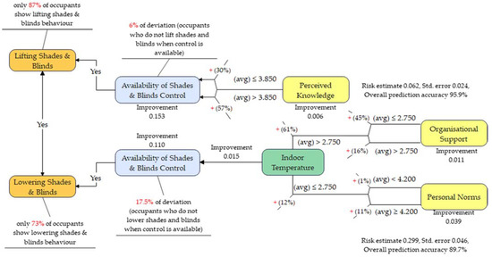 Figure 5 illustrates the summary results of the decision tree models of adjusting shades and blinds. As shown in Figure 5, 87% of occupants indicated lifting shades and blinds in their workplace, while 73% responded to lowering shades and blinds. The most influential predictor of shades and blinds behaviour is the availability of shades and blind control, followed by the occupants’ perceived knowledge. The occupants who use their knowledge of energy-saving more tend to lift shades and blinds more. This model achieved a 95.9% prediction accuracy, with a 6% risk of misclassification per the cross-validation. The other predictors for lowering shades and blinds are indoor temperature conditions, organisational support, and personal norms. The model, including these three predictors and the availability of control, achieved an 89.7% of prediction accuracy. When occupants perceive the indoor temperature discomfort, the organisation’s encouragement to save energy and reward for savings is less, and the occupants’ responsibility to save energy is more; the majority lower the shades and blinds. Although the observed deviation of occupants who did not engage in lowering shades and blinds was 17.5%, a risk estimate of 30% was given from the model, indicating misclassifying an occupant into this behaviour driven by the model predictors. Our findings aligned with the fact that the adjustment of shades and blinds is influenced by the availability of controls [36]. Another factor that influences the lowering of shades and blinds is the indoor temperature [36]. According to the authors, most occupants close the shades and blinds when satisfied with the indoor temperature. Furthermore, the authors highlighted other significant predictors: IEQ satisfaction, intention, attitudes, ease of sharing control, and the frequency of negotiation, where authors showed the inverse relationship between IEQ satisfaction and adjusting shades and blinds. However, our study highlights the influence of other social-psychological factors: perceived knowledge, organisational support, and personal norms. Zhang et al. supported that when the organisational support is weak, the occupants’ obligation/responsibility strongly influences energy-saving behaviour [60]. Similar to window behaviour, the influence of environmental conditions was widely highlighted in the existing literature regarding shades and blinds. For instance, solar radiation [61], building occupancy, illuminance, and glare [62] influence the adjustment of shades and blinds.
