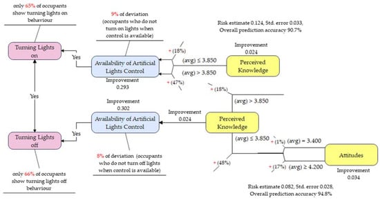 Figure 6 summarises the decision tree analysis results on occupants’ lighting behaviours. According to Figure 6, the lighting behaviour is relatively lower than the behaviours relating to windows, shades, and blinds. Overall, 65% of occupants turned lights on at their workplace, and 66% turned them off. The main predictors of these behaviours include the availability of artificial lighting control, while other factors are perceived knowledge and attitudes. According to the model, the occupants who use their energy-saving knowledge more turn on the artificial lights if the control is available, while the turning-on behaviour is expected but much lower when this knowledge is less. However, an inverse relationship between perceived knowledge was observed considering the turning off lights. The occupants with strong energy-saving attitudes but who utilise energy-saving knowledge less would turn off lights more if the control is available. Even though the risk estimates of turning lights on (12.5%) and turning lights off (8%) are lower, the models are counterintuitive. Bavaresco et al. highlighted the availability of lighting control as the main predictor of adjusting the lighting in the buildings [31]. Unlike the study by Bavaresco et al., our study highlights attitude as a contributing factor for turning off lights, not turning them on. However, more focus was given to the related environmental factors such as illuminance level [63] and time-related factors (i.e., upon arrival, upon leaving) [64], while our study highlighted the influence of social-psychological factors on occupants’ lighting behaviour, which was supported by [28]. Even an occupant with lower energy-saving knowledge may turn off the lights if the control is available, and a strong energy-saving attitude is also a factor. Furthermore, occupants’ strong perceived knowledge was reflected when 91% of lighting adjustments occurred soon after the occupants’ arrival and shortly before the occupants left [65].