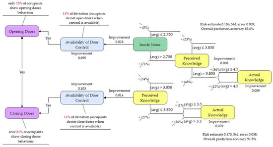The decision tree models of the opening and closing doors are presented in Figure 7. As seen in Figure 7, 78% of occupants show opening doors behaviour, while 81% show closing behaviour. The control availability for the doors is the main predictor for both models. Other common predictors of both models are perceived knowledge and actual knowledge. However, opening doors depend on the inside noise level, and most opening occurs on the noisy side. This could be the noise inside their office space (i.e., single, shared, open-plan), from corridors, and the following office spaces. Most opening doors are also linked to occupants who use their energy-saving knowledge more and lack awareness of energy-saving benefits. The risk estimate of this model is 18.6%, with a prediction accuracy of 85.6%. Similarly, most closing actions occur when occupants use their energy-saving knowledge more. However, the closing can also occur when they do not use energy-saving knowledge much and have more awareness of energy-saving benefits. Such a model provides a prediction accuracy of 91.8% with a risk estimate of 17.5%. Our study is the first to evaluate the factors influencing the occupants’ door behaviour. Similarly, Deme Belafi et al. suggested that the adjustment of doors influences energy consumption [33]. For example, if occupants keep doors open in an air-conditioned space, that will fluctuate the indoor temperature, and more energy will be required to cool down the space. Future research can further evaluate this behaviour.