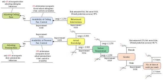 The fan adjustment behaviour of occupants was evaluated by considering ceiling fans and personal fans. Figure 8 illustrates the decision tree models for these two behaviours. As shown in Figure 8, only 4% of occupants adjust ceiling fans, as most of the 99 observations responded that the ceiling fans are not available in their workspace or have no control. The prediction accuracy of this model is 99%, with a 4.1% risk estimate. Availability of ceiling fan control is the main predictor, followed by behavioural interventions by the organisation. Regarding personal fans, the study observed that 45% of occupants adjust their personal fans, and the main predictor is the availability of personal fan control. Other predictors contributing to this behaviour are occupants’ actual knowledge, indoor temperature, gender, and the number of days at work per week. These predictors further indicate that occupants should be more aware of energy-saving benefits, perceive that the indoor temperature is uncomfortable, and work more than five days per week if they are a male. The model has a prediction accuracy of 88.7%; however, the risk estimate is 27.8%. He et al. identified that indoor or outdoor temperatures are the primary triggers of fan usage, and accordingly, numerous models were established to estimate fan use behaviour in buildings [66]. However, our study highlights the availability of fan control as the primary trigger and the indoor temperature as another essential factor. Other social-psychological factors: behavioural interventions and actual knowledge, and demographic factors: gender and no. of days at work per week, are also important considering the occupants’ fan behaviour. Behavioural interventions such as plug strips to turn off the power when the sensor does not detect any occupancy and sending emails to turn off equipment when unoccupied are often used to reduce plug load profiles, including fans [67].