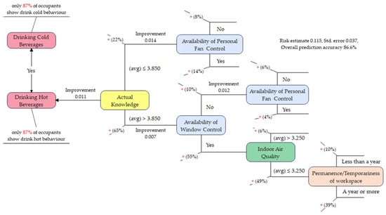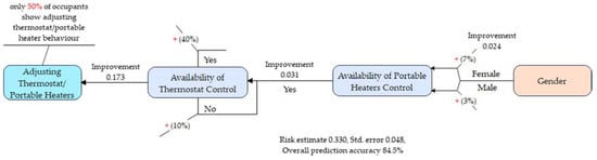 Figure 9 indicates the decision tree model developed for thermostat/portable heaters adjustment behaviour. Similar to lighting and personal fan behaviour, thermostats and portable heaters show only 50% of occupants’ responses. Of the majority, the main predictor of adjusting the thermostat is the availability of thermostat control, while adjusting portable heaters occurs when the thermostat control is not available but the occupants can operate a portable heater. Gender is another predictor linked to the availability of control over portable heaters, and most females tend to adjust portable heaters. The prediction accuracy of this model is 84.5%, with a higher risk estimate of 33%. Our study aligns with the findings of Bavaresco et al., which identified the availability of thermostat control as the primary predictor. In another study, Park and Nagy introduced HVACLearn, an occupant-centric controller (OCC) for thermostats where occupants could express the thermal sensation as too cold or too hot [68]. Additionally, the same authors highlighted the influence of other factors, frequency of negotiation of control, knowledge to control, IEQ satisfaction, productivity beliefs, and the no. of hours spent in the office. On the other hand, our study highlights the influence of the availability of portable heater control and gender. Similarly, Sintov et al. examined the gender influence on interactions with thermostat adjustments [69]. Their results suggested that women report conflicts while men report agreements and compromises engaging in thermostat adjustments. However, both men and women will adjust a thermostat on a given day.