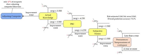 Figure 10 presents the decision tree analysis of another behaviour, the occupants’ computer adjustment behaviour. This behaviour evaluates whether occupants turn off the computers when they leave and put them into sleep mode when unattended for an extended period. The model shows that only 47% of respondents adjust their computers, and the main predictor of this behaviour is the occupants’ actual knowledge or awareness of energy-saving benefits. If the occupants have more knowledge of these energy-saving benefits, they tend to adjust the computers more. Other predictors of this behaviour are perceived ease/difficulty in saving energy, pressure from co-workers’ to save energy, and permanence/temporariness of the workspace. The model predicts the behaviour with an accuracy of 73.2%, and the estimated risk is 26.8%. Unlike our study, previous studies highlighted the influence of the behavioural intervention on occupants’ computer adjustment and related savings [70]. Another factor considered necessary was occupancy schedules Zhao et al., whereas Kwong et al. showed that plug load of computers after working hours contributes substantially to the energy demand [71]. However, our study highlighted how social-psychological factors primarily influence this behaviour, and the influence of actual knowledge, PBC, and subjective norms was supported by [28]. Research elsewhere supported that PBC and perceived substantial expectations from others about occupant energy-related behaviours increase energy-saving behaviours [72].