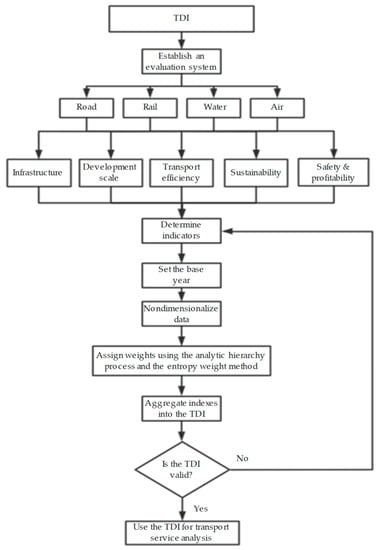 The TDI was constructed taking into consideration the existing research results and the development of Yunnan’s transport industry, involving the following steps: establishing an evaluation system, determining indicators, processing data, setting weights and the base year, and aggregating the indicators into indexes. Figure 1 shows the research approaches and procedure of this paper.
