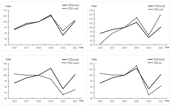 The total TDI shows a steady upward trend between 2016 and 2019, following a dramatic decline. After reaching the trough in 2020, it starts to recover but fails to reach the 2019 peak in 2021. TDI-road has the most similar values and trends to the total TDI, and it is slightly higher than the total TDI in 2020. TDI-rail rises rapidly between 2016 and 2019, declines in 2020, but surges back up to a new high in 2021. TDI-water continues to decline between 2016 and 2020, with a steep drop in 2020, and then starts to recover but fails to reach its 2019 level in 2021. TDI-air shows an upward trend between 2016 and 2019, and a slow recovery in 2021 after a decline in 2020.