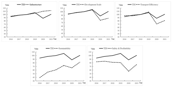 Table 8 below lists the values of the indexes for the infrastructure, development scale, transport efficiency, sustainability, and safety and profitability, and Figure 3 shows their trends compared to the TDI trend.