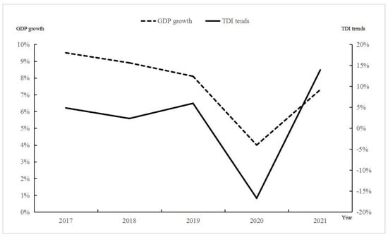 To verify the linkage between the TDI and regional macroeconomy, we conducted a correlation analysis between the TDI and Yunnan’s GDP, and the result was 0.913, meaning a strong positive correlation between them. Figure 4 below shows their trends.