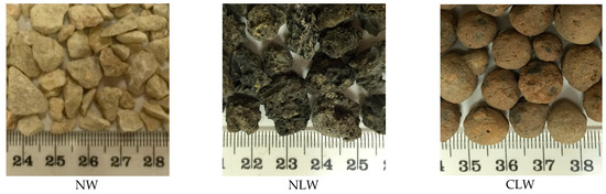 To prepare the green lightweight concrete including the plastic waste, various other ingredients were also added. Ordinary Portland cement which is manufactured locally and complies with the standard specifications was used. In the current study four aggregate series were used i.e., normal weight aggregate (NW), naturally occurring lightweight aggregate (NLW), commercially available lightweight aggregate (CLW), and green manufactured plastic aggregate (GMPA). The details of the manufacturing of green plastic aggregates and their properties will be discussed in the following section. The NW, NLW, and CLW aggregates as shown in Figure 3 were used as references, to compare the properties of the GMPA. The NW and NLW were also used to prepare two reference concrete series to compare the properties of concrete containing GMPA. NW and NLW were obtained from a local trader while Lytag Limited delivered the CLW. The sieve analysis results for NW and NLW are shown in Figure 4. The red sand and crushed sand were used in this study as fine aggregates. To optimize the particle size distribution as per the [44,45], the red sand and crushed sand were added in a percentage of 65% and 35% respectively. The sieve analysis result for optimized fine aggregate is shown in Figure 5.