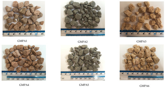 The plastic waste used for the current experimental study was provided by a resident recycling company that accumulates different types of plastic waste from the surrounding areas. After gathering the plastic waste, it is purified, shredded, melted, pelletized, and disintegrated into fragments or fine powder. In the current study, disposable PET water bottles were used as a primary source of plastic. Three different filler types were also selected i.e., dune sand, quarry fines, and fly ash. All three of the filler materials were selected to make the plastic aggregate environmentally friendly as they represent either the by-product (quarry fines and fly ash) or the abundantly occur cheap material (dune sand). As discussed in the Section 1, different filler types lead to different physical and mechanical properties of the resulting manufactured aggregate. Therefore, to optimize the filler type and percentage of plastic waste, six different types of aggregate series were produced. The detailed mixing proportions are tabulated below in Table 4. All the aggregates series were manufactured using the experimental procedure patented by [55]. All the Green Manufactured Plastic Aggregate (GMPA) series are shown in Figure 6. It was observed that the different filler types have resulted in different colors of produced GMPA series. The GMPA series manufactured using quarry fines, fly ash and dune sand appeared to be yellow, grey and brown respectively.