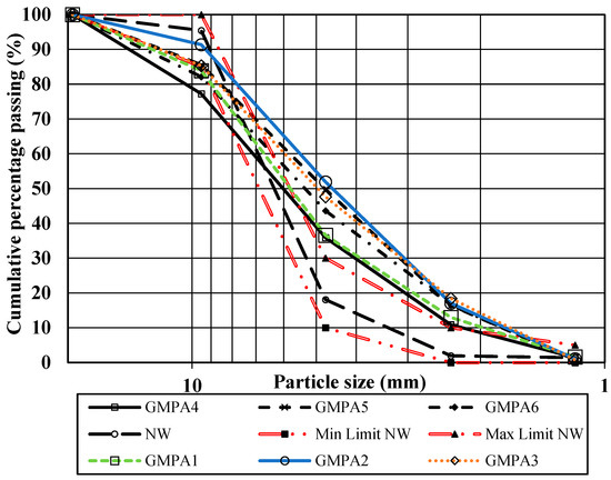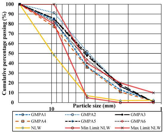 It was observed from the above graphs that the GMPA series have exhibited different behaviors. GMPA1 series have been found to comply fully with the [56] conditions while GMPA2, GMPA3, GMPA5, and GMPA6 series diverged by23, 16, 19 and 8%, respectively from the upper limit of sieve no. 4. However, GMPA4 series deviated by 3.5%, while NLW significantly diverged by 39% from the lower limits of sieve no. 3/8. It was determined from these results that the GMPA series developed by using dune dust were coarser as compared to the GMPA series developed by quarry dust/fines or fly ash fillers. The least coarse particles were the ones developed by using fly ash as they had the smallest size amongst all three fillers. On the contrary, it was observed from Figure 8 that the developed GMPA series do not fulfill the grading requirements of the normal weight aggregates.