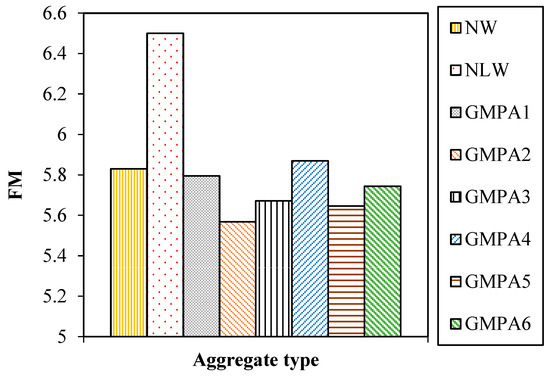The fineness modulus (FM) values strongly correlate with the identification of the coarse material and vice versa [57]. The FM values help in estimating the coarseness and comparative analysis between particle sizes. The results for the fineness modulus FM for the GMPA series are shown in Figure 9 along with the two-reference series of NW and NLW.