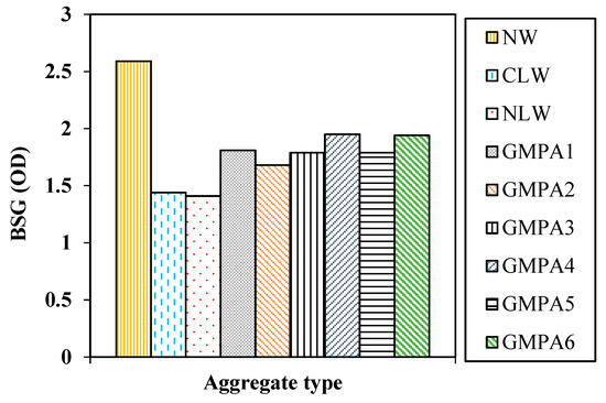 The bulk specific gravity (BSG) is the ratio of the weight of a given volume of aggregate, including the permeable and impermeable voids in the particles, equated to the weight of an equal volume of water [58]. The variation of oven dry bulk specific gravity BSG (OD) values for GMPA series along with NW, NLW, and CLW is shown in Figure 10. It was noticed that the specific gravity of the GMPA series increased for both percentages of plastic and all types of fillers when compared with NLW and CLW. The maximum percentage increase for the GMPA series was noted to be 38% and 35% with regard to NLW and CLW respectively. However, the specific gravity of GMPA was 25 to 35% less than that of the NW series.