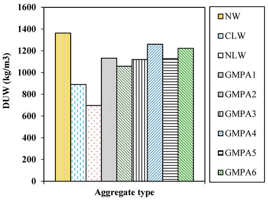The results of dry unit weight (DUW) for the GMPA series along with NW, NLW, and CLW are shown in Figure 12. It was observed that the dry unit weight of the GMPA series showed a decreasing trend in comparison with NW while the values were found to increase with respect to NLW and CLW series. The dry unit weight of the GMPA series decreased by 8 to 22% in comparison to NW while the increase in GMPA dry unit weight varied between 52 to 80% and 19 to 42% with respect to NLW and CLW aggregate series. In addition, it was also noticed that an increase in the percentages of filler percentage in the aggregate matrix caused an increase in the dry unit weight of the manufactured aggregate irrespective of filler type. The highest values of dry unit weight at each percentage of plastic are shown by the dune dust filler while fly ash fillers had shown the lowest values. The increase was found to be 11, 7, and 9% for dune dust, fly ash, and quarry dust respectively. The major reason is that higher-density materials (fillers) have replaced the lower-density material (recycled plastic) in the aggregate matrix. The same trend was observed as reported in a previous study [31,32].