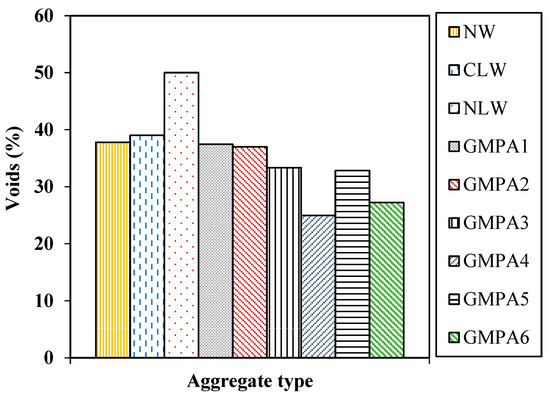 The comparisons between the voids’ percentages for the GMPA series along NW, NLW, and CLW are shown in Figure 13. It was observed that the GMPA series have shown a decreasing trend for the void percentage as compared to all three reference aggregate series. The decrease was found to vary between 25 to 45.5%, 4 to 36%, and 1 to 34% with respect to NLW, CLW, and NW series respectively. In addition, it was also noticed that the increase in the filler percentage for a given plastic content reduced the void content for all types of fillers. The decrease in the void percentage varied between 11 to 18% to increase the filler percentage from 50 to 70%. This reduction is mainly because of the increase in packing density with an increase in the percentage of more fine material instead of plastic particles.