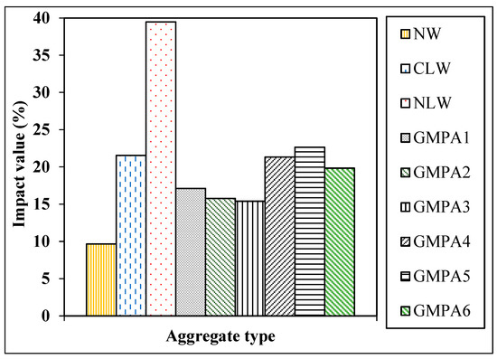The results of the impact value test for the GMPA series along with NW, NLW, and CLW are shown in Figure 14. The impact values for NW, NLW and CLW were found to be were 9.7, 39 and 21.6% respectively. The GMPA series have shown the ability to be crushed upon impact and have shown a decrease in the values by 43 to 61% with reference to NLW. Similarly, in comparison with CLW, a reduction ranging from 1.1 to 28.5% was observed; except for GMPA5, which had a marginal increase (i.e., 5%). However, in comparison with NW, substantial increases in the aggregate impact value, varying from 60 to 135%, were also observed.