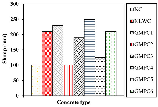 The slump and fresh densities of the concrete containing green manufactured plastic aggregates were determined to evaluate the fresh behavior of the aforementioned concrete and a comparison was made with concrete having normal weight and naturally light weight aggregates. The slump results for concrete containing six different types of GMPA series along with NC and NLWC are shown in Figure 15. It was noticed that the slump values increased with reference to NC; whereas fluctuating results were seen as compared with NLWC, as shown in Figure 15. The increase in slump varied between 25 and 150% as compared to NC. The reported values of slump were found to be in line with existing studies which observed a similar increasing trend ranging from 51 to 123% at 75% replacement of NA with plastic-based aggregate [20,21]. However, with respect to NLWC, the slump of GMPC1 and GMPC4 increased by 10 and 19%; while that of GMPC2, GMPC3, and GMPC5 decreased by 52, 10, and 40% respectively. It was noticed that the slump variation was found to have an inverse relation with the size of the aggregates as GMPC1 and GMPC4 have shown the highest slump values correspondingly their respective aggregates had the maximum size. Accordingly, the packing level reduces with the coarser aggregates, which would decrease the demand for cement paste, which ultimately increases the workability of the mix.