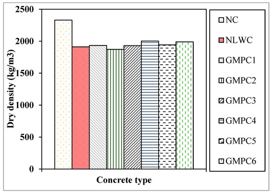 Overall, it was noticed that the dry density values of the concrete containing six different types of GMPA were found to be inside the boundaries (i.e., 1400–1900 kg/m3) specified in [63] with a marginal increase (6%).