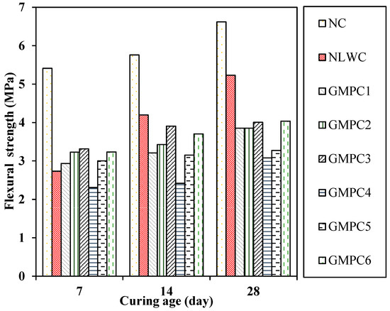 Interestingly, Figure 19 indicates that the RPAC-2 achieved a higher flexural strength (i.e., 7–21%) at 7 days; except for GMPC4, which had 15% lower strength compared to LWC. On the other hand, with an increase in the curing period i.e., at 14 and 28 days GMPA had shown lessened flexural strength values in comparison to NC and NLWC. It was noticed that the lowest lessening in 28-day flexural strength was found to be 39 and 23%, as compared to NC and LWC respectively, for GMPC3 and GMPC6. While, the highest reduction was observed in GMPC3, which was 53 and 41% lower with respect to NC and LWC. This trend can be because of the increased aggregate strength of the GMPA3 and GMPA4 series. In addition, a reduction varying from 15 to 20% was found for the GMPC series when the percentage of filler was increased in the aggregate matrix, as observed with compressive strength