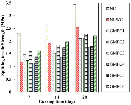 Overall, the present study’s results reveal that the 28-day flexural strength of GMPC was less strong than conventional concrete (NLWC and NC). Nonetheless, these reductions are less compared to those reported in other studies i.e., the lessening of flexural strength was observed to vary from 50 to 59% at the replacement level of manufactured plastic aggregates of 15–50% [15,27]. To make an assessment compared to [56] criteria, which specifies the lowest boundary value for splitting tensile strength as 2.1 MPa, the flexural stresses will be converted to equivalent splitting tensile strength for the current concrete results by using the relation proposed [65,66], i.e., the splitting tensile strength is equal to 0.75 times the flexural strength for the given concrete. Thus, the estimated 28-day splitting tensile strength for GMPC ranged from 2.3 to 3.03 MPa, which is clearly greater than the limit described in [56].