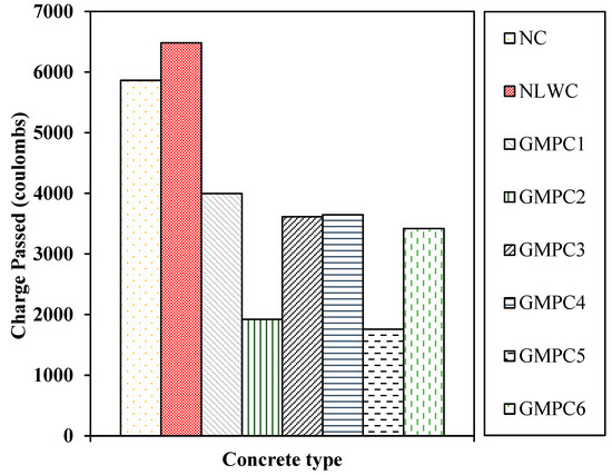 In addition, GMPC2 and GMPC5 have shown the minimum values of chloride permeability among the GMPC series. GMPC2 and GMPC4 have yielded a significant reduction varying from 67 to 70% and from 70 to 73%, in comparison with NC and LWC respectively. However, the highest permeability was found in GMPC1 and GMPC4. The percentage decrease varied between 32 to 38% and 38 to 44% with respect to NC and NLWC respectively. The change in the permeability values for the GMPC series is mainly linked to the packing percentage of the concrete. The coarser aggregates generally yield less dense structure leading to higher permeability values as is the case of GMPA1 and GMPA4.