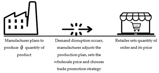 Numerous factors can impact the optimal design of trade promotions, such as sales targets, product characteristics, demand uncertainty, and product delivery [8,9,10,11,12,13]. Demand disruption can alter market uncertainty and, as a result, influence trade promotion strategies. There are various real-world examples of promotion strategies to manage demand disruption adopted by companies. For instance, the sudden outbreak of avian influenza (H7N9) in China in 2013 resulted in a decline in demand for caged eggs, leading farmers to offer large discounts to retailers and consumers on their products, while the opposite occurred for seafood and certain medications. Another example is the COVID-19 pandemic, during which companies with online sales were able to maintain their sales while many physical stores had to close, particularly in the second quarter of 2020 [14]. These and other real-world situations demonstrate the significant economic impact that studying the effects of demand disruption on trade promotion can have. The examination of negative demand disruption within the context of trade promotions is crucial for several reasons. Firstly, trade promotions may be utilized as a means to generate demand in the face of a negative demand disruption. Secondly, firms may have a predetermined budget for marketing and promotions efforts, making it important to consider the impact of demand disruption in the formulation of sustainable trade promotion strategies.