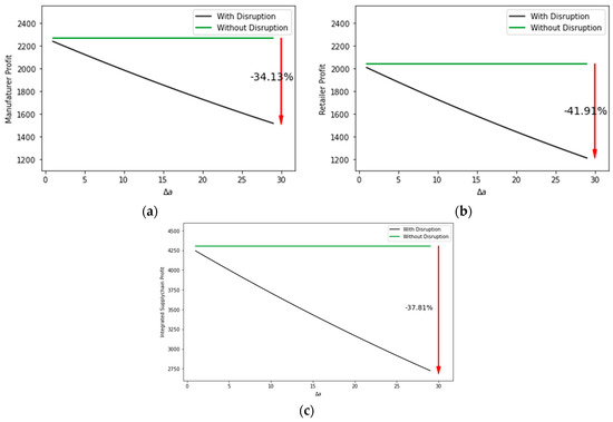 As illustrated in Figure 3a–c, a negative demand disruption in the range [0–30] or equally 0% to −26.8% negative disruption in demand leads to a decrease in the profit of the manufacturer, retailer, and integrated supply chain by −34.13%, −41.91%, and −37.81%, respectively. This is due to the fact that higher levels of disruption intensity result in a greater impact on the customer demand and manufacturer’s production schedule, leading to an increase in the manufacturer’s costs and a corresponding decrease in the profit of the manufacturer, supply chain, and its members. In addition, because disruption affects more factors of the retailer’s profit, including the wholesale price, order quantity, and retailer price, causes to decrease in the retailer’s profit more than the manufacturer’s.