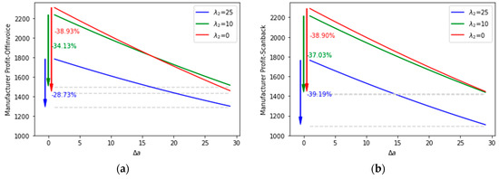 Figure 4 displays the profit of manufacturers under different trade promotion policies in the presence of negative demand disruption. As shown in both Figure 4a,b, the profit of manufacturers decreases as the intensity of negative demand disruption increases. This is due to the fact that demand decreases with negative demand disruption. In the off-invoice policy, higher disposal costs lead to lower profit for manufacturers before due to increased costs. However, after this point, disposal costs of lead to higher profit as the wholesale price decreases and stimulates more consumers’ demand that compensates for the associated costs. In contrast, this phenomenon occurs later in the scan-back policy. This may be because, in the scan-back policy, discounts are only paid after the retailer has sold the products. Furthermore, the rate of diminishing returns is higher under the scan-back policy compared to the off-invoice policy, particularly when disposal costs are higher. This suggests that the off-invoice policy may be a more sustainable strategy in such circumstances. This may be because the retailer places larger orders in the off-invoice strategy than in the scan-back back [23], allowing the manufacturer to earn more profit even in the presence of negative demand disruption.