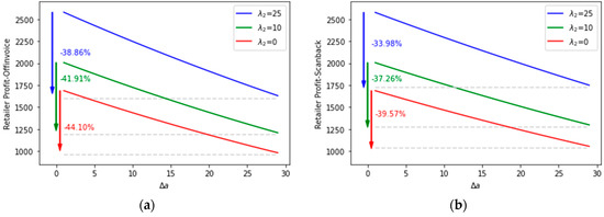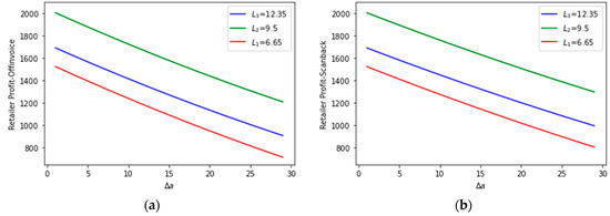 As demonstrated in Figure 7a,b, negative demand disruption and a decline in demand lead to a reduction in retailers’ profits in both off-invoice and scan-back policies. However, the impact of a change in delivery lead time on retailers’ profits exhibits a non-linear pattern in the range considered in this study. Specifically, results in higher retailer profit compared to and , and leads to higher profit compared to . This behavior is expected due to the quadratic form of the delivery lead time in the retailer’s profit.