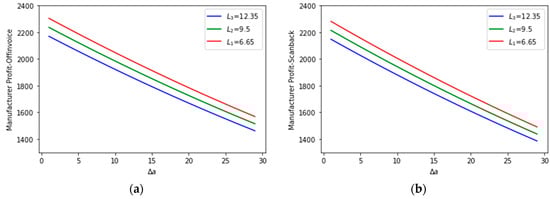 Manufacturer’s profit with different delivery lead times (L) in (a) off-invoice and (b) scan-back ().