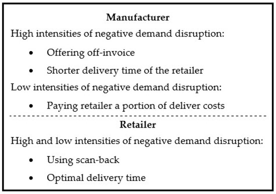 First, manufacturers should consider taking action to reduce disposal costs when negative demand disruption occurs, as higher disposal costs lead to lower profits. The results of this study suggest that in sudden crises such as a global or national outbreak of diseases (similar to COVID-19), massive earthquakes, or economic crises which causes huge negative disruption in demand [6], the off-invoice policy in higher disposal costs may be a more beneficial and sustainable strategy for manufacturers. Thus, it is recommended that manufacturers use off-invoice policy in countries with high economical fluctuations. On the other hand, the scan-back policy may be more profitable for retailers, particularly when the intensity of negative disruption is high.