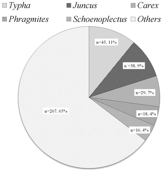 - Sesin, V.; Davy, C.M.; Freeland, J.R. Review of Typha Spp. (Cattails) as Toxicity Test Species for the Risk Assessment of Environmental Contaminants on Emergent Macrophytes. Environ. Pollut. 2021, 284, 117105. [Google Scholar] [CrossRef] [PubMed]