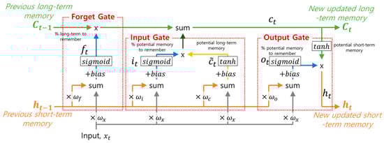 The long short-term memory (LSTM) model is a recurrent neural network designed to avoid the exploding and vanishing gradient problem. The information from the previous moment is closely related to the current and next steps, typically when sequential data is considered. Although the traditional networks commonly used in the time series are independent of each other, LSTM is composed of several storage gates using both sigmoid activation functions, i.e., , and hyperbolic tangent activation function, i.e., . The sigmoid activation function handles any x-axis coordinate between 0 and 1. In contrast, the hyperbolic tangent activation function takes any x-axis coordinate and turns it into a y-axis coordinate between −1 and 1. With the storage gates using such processes, the information remembered from the previous moment can be reflected to determine current outputs. The basic structure of a single LSTM unit is illustrated in Figure 1. There are three gates (i.e., forget, input, and output), and each gate protects and controls the long- and short-term memory information in a time horizon.