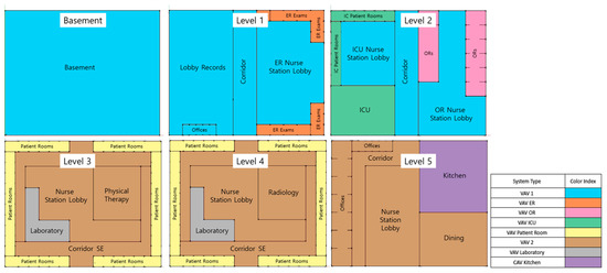 The prototype hospital building model has VAV-type HVAC systems with natural gas boilers and chillers for thermal zones mostly. This VAV system is an air conditioning system that varies the supply air volume flow rate through the air handling units (AHUs) using dampers located in the VAV thermal box to curtail heating and cooling loads and meet the setpoint temperature. Figure 3 depicts HVAC zoning and its system types in the hospital building model. Except for the kitchen zone, all thermal zones use VAV-type systems. VAV 1 and 2 consist of typical AHUs with VAV reheat boxes. Humidifiers, extra water, and electric heating coils were added to the AHUs of other VAV systems (i.e., VAV ER, OR, ICU, Patient Room, and Laboratory). All the heating and cooling energy end-usages by gas boilers and chillers were considered for the training and testing datasets of the LSTM-TL predictions.