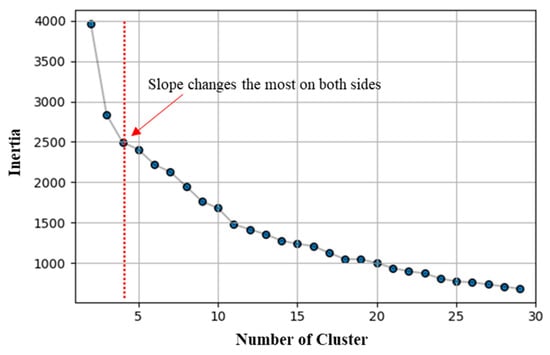 The cluster analysis was carried out as follows. Each time series dataset was considered in the first step. For example, the datasets from the EnergyPlus simulation were formed as , and the length of each data was based on the length of cooling and heating periods. N indicated the number of output variables. The initial numbers were output sets of 351 columns, but similar output types were grouped and shortened based on similar schedules and thermal zone conditions. Data standardization was carried out using Python language’s mean removal and variance scaling. Figure 5 presents the appropriate inertia number option. Four was considered the optimal K value for this study by considering the available measurement conditions and decreased inertia points. Based on the defined K number, the centroid was determined at random. The elements to the corresponding type are then described based on the distance between elements and the centroid. Finally, the centroid was recalculated according to the new aspects using expectation maximization and EM algorithms. The steps were iterated until the data converges with the defined value.