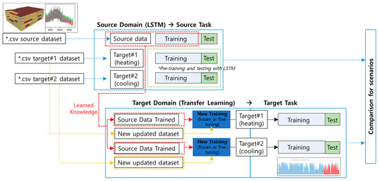 To overcome such limitations, the transfer learning process with LSTM has been implemented to improve the performance accuracy of newly given target tasks with a limited dataset. Due to remarkable performance despite low training dataset samples, transfer learning has been widely adopted in graphics recognition, text classification, web page classification, and many other areas [31]. Transfer learning (TL) is a learning mechanism that can address such issues by reusing the information obtained when solving related tasks in the past and applying prebuilt models from other domains to help solve new tasks [32]. Peng et al. [33] proposed a multi-source transfer learning guided ensemble LSTM method by combining TL and fine-tuning technology. Results from their practical applications showed that the proposed model could enhance load forecasting performance with TL with relatively few measured data. Ma et al. [34] presented the hybrid LSTM model with bi-directional imputation and TL. Their comparative analysis demonstrated that LSTM with bi-directional imputation and TL gave outperforming outcomes compared to other data-driven models under different missing rates. Li et al. [35] compared three different deep TL strategies. Their results provided insights into the practical applications of TL approaches when building energy performance models with insufficiently measured data. Ahn and Kim [36] presented building power use forecasting based on the LSTM with TL (LSTM-TL) method using simulated and measured data 24 h ahead. The developed LSTM-TL model outperformed alternatives by presenting higher office building power consumption accuracy. Based on the literature review, many existing studies have adopted TL-based prediction techniques with the LSTM algorithm for building applications. The features of datasets and TL design can vary according to the case studies and their assumptions. For example, Mocanu et al. [37] used hourly measured datasets recorded over seven years from residential and commercial buildings for a different time horizon forecasting with two standard reinforcement learning algorithms. Fang et al. [38] used open-source datasets of about 100 days for the source period and ten days of datasets for the target period train and test periods. The domain adoption-based TL model was used for building energy use prediction. Ahn and Kim [36] considered simulated data for source datasets, and they predicted the hourly energy consumption of an office building type 24 h ahead of the target dataset of measured data. A small-sized office prototype model developed by the Pacific Northwest National Laboratory (PNNL) with support from the US Department of Energy (DOE) was used to create simulated datasets for their case study. As demonstrated in the current literature review, the advancement of LSTM-TL models has been explored based on many case studies. However, there are still several concerns about the adoption of such data-driven models for practical applications, such as lack of awareness and data collection, specifically when different building types are considered without sufficient data measured in a detailed manner.