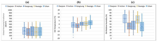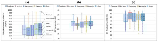 The hospital prototype building models were placed in four cities in South Korea to generate testing data for target domain tasks. This study considered the four weather data locations that the EnergyPlus weather data website officially provides [44]. The EnergyPlus website provides typical meteorological year version 3 (TMY3) for hourly weather files of the city, which is based on design conditions from the climate design data ASHRAE Handbook [45], to calculate heating and cooling loads [45]. Figure 10 and Figure 11 show the compared values of each city’s weather data for cooling and heating periods, respectively, including global horizontal irradiance (GHI) with units, W/m², outdoor air-dry bulb temperature, and relative humidity. The cooling period graph was created based on the weather data values for August, while the heating period used for this weather graph was January. The box and whisker diagram of each comparison indicates the maximum, minimum, mean, and other values, as shown in the figures. The three values (i.e., GHI, OA temperature, and relative humidity) were directly used for the input dataset of the developed LSTM model. Daejeon was used for source domain tasks, and other locations were thus used for target domain tasks in this study.