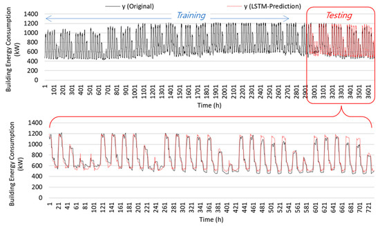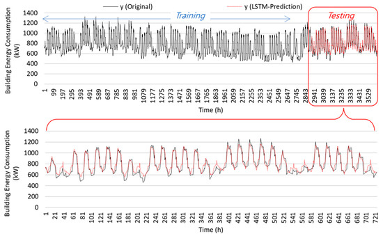 Figure 13 and Figure 14 show a comparison of the hospital building’s energy consumption for the representative cooling and heating periods using the 5-month simulated data. The 5-month simulated data was first used for training and testing using the initially developed LSTM model for each season. This study assumes that the cooling period is from May to September, and the heating period is from November to March. During the cooling period, the building energy end-use used for this analysis did not include heating-related energy consumption, such as natural gas usage consumed by heating boilers. Therefore, the building energy consumption for this period indicates the internal heat gain-related electricity use (e.g., lighting and plug demands) and cooling-related electricity use (e.g., chillers, AHU fans, and extra electrical reheat coils). In contrast, for the heating period, the main heating coils in AHUs associated with heating boilers and extra electrical reheat coils are the main energy parts in the building’s energy consumption instead of the cooling-related components. The internal heat gain-related electricity end-use is also one of the contributors to building energy consumption with the heating-related energy components.