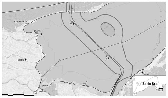 Location of the sampling stations marked with dots (no. 1–6) in the western part of Vistula Lagoon (southern Baltic Sea, Poland). Grey lines present the planned Vistula Split and fairway with the range of investment impact (according to https://www.umgdy.gov.pl/wp-content/uploads/2015/07/TI_Karta_Informacyjna_Przedsiewziecia.pdf (accessed on 20 December 2022), modified).