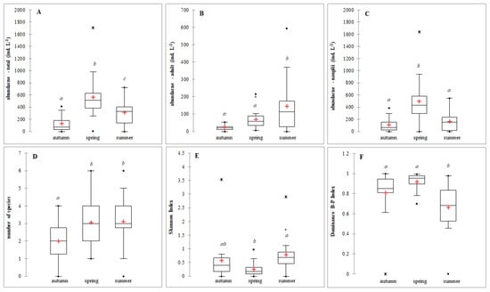 Seasonal changes of abundance (A)—abundance total; (B)—abundance of adult form, without copepodites and nauplii; (C)—abundance of nauplii) and diversity (D)—number of species; (E)—Shannon index; (F)—dominance B–P index) of crustacean zooplankton in Vistula Lagoon (2019–2021). The different italics letters (a, b, c) above the box plots indicated significantly different values at p < 0.05, while the same letters mean no significant differences.