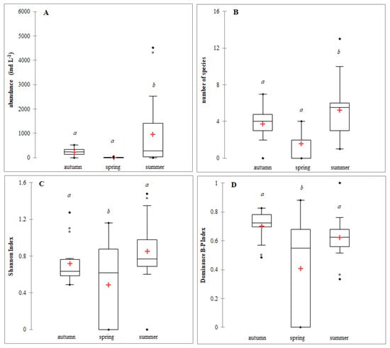 Seasonal changes of (A) abundance and diversity; (B) number of species; (C) Shannon index; and (D) dominance B–P index of Rotifera in Vistula Lagoon (2019–2021). The different italics letters (a, b) above the box plots indicated significantly different values at p < 0.05, while the same letters mean no significant differences.