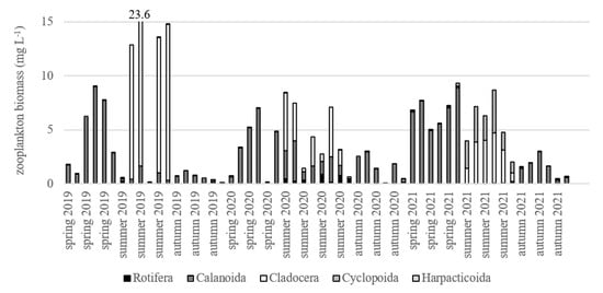 The biomass of zooplankton ranged from 0.04 to 23.6 mg L−1 (Figure 4), with an average of 4.50 ± 4.49 mg L−1. The crustaceans strongly dominated over Rotifera (Figure 4), with average biomasses of 4.40 ± 4.51 mg L−1 and 0.09 ± 0.17 mg L−1, respectively. High biomasses of zooplankton were recorded in summer and spring and low biomasses were recorded in autumn. Additionally, the year 2019 was distinguished by higher zooplankton biomasses (Figure 4).