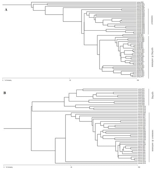 The similarity of Crustacea (A) and Rotifera (B) communities visualized by agglomerative hierarchical cluster analysis (AHC) based on the Bray–Curtis similarity matrix.