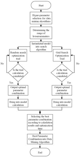 When using GMS and RSM to optimize the data mining algorithm, first, because the XGBoost and SVM algorithms have many superparameters, all optimizations will increase the computer memory challenges and greatly increase the optimization time. For the XGBoost algorithm, the following four main parameters are selected for optimization: the number of trees (n_estimators), the maximum depth of the tree (max_depth), the minimum leaf node sample weight (min_child_weight) and the step size (learning_rate). For the SVM algorithm, the following three main parameters are selected for optimization: penalty coefficient (C), kernel function parameter (gamma), and damage function (epsilon). Second, the value range of the selected superparameter is determined according to its own characteristics. Next, the instantiation model of the SVM and XGBoost algorithms is established, and the selected superparameter combination is applied to the instantiation model using the search algorithm for trial calculation. After the trial calculation, the best superparameter combination is selected according to the output results of the model and the optimization time. Finally, the selected superparameter combination is brought into the algorithm. The algorithm optimization process is shown in Figure 1.