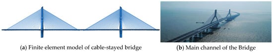 Elaborate modelling was carried out using Abaqus software, and the main beam, reinforcement, and stay cable were established by importing the Abaqus sketch. The stay cable is simulated by the B31 element, the prestressed reinforcement is simulated by the T3D2 element, the cable tower is simulated by the C3D10 element, the main beam is simulated by the C3D8R element, the concrete section property of the main beam and cable tower is solid homogeneous, the section property of the stay cable and prestressed reinforcement is truss, the prestressed reinforcement adopts built-in interaction in the model, and the cooling method [20] is used to apply prestress. The stress concentration and the subdivision grid at the pier. Modal dynamic analysis was adopted as the analysis step. The benchmark finite element model was established via the model correction method [21]. The finite element model and actual photos are shown in Figure 4.