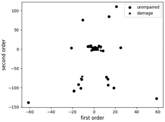 Solving the SVM algorithm obtains the maximum value of under the constraint conditions. In the damage location of cable-stayed bridges, the dataset X is divided into two categories by separating the hyperplane: one is the damaged location, and the other is the undamaged location.