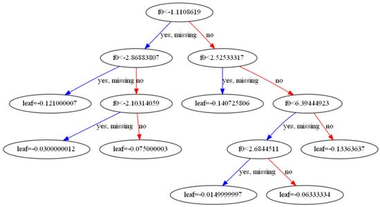 When using the index of the change rate of modal curvature for damage diagnosis, the data are divided by the data division function (train_test_split), and the division ratio of the training set and test set is 4:1. The input vector of the SVM algorithm is shown in Figure 5, where two colors represent different health states, red for the damaged state and purple for the uninjured state. The single tree of the XGBoost algorithm uses Equation (3) to fit parameters in the damage diagnosis process, as shown in Figure 6. The SVM and XGBoost algorithms are used to learn training samples and establish corresponding models. The detection results of the model performance are as follows: the accuracy of damage location is compared through the test set, training set and cross-validation score. The mean-square error (MSE) and cross-validation results are used for damage quantification, and the damage localization and quantitative identification results are shown in Figure 7. The results of damage location and cross-validation are shown in Figure 8, and the results of damage quantitative cross-validation are shown in Figure 9.