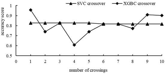 Figure 8 shows that the cross-validation scores of the SVM algorithm the second, fourth, fifth and eighth time were all higher than those of the XGBoost algorithm, and the 10% cross-validation score of the SVM algorithm was more average, and the stability was better than the XGBoost algorithm.