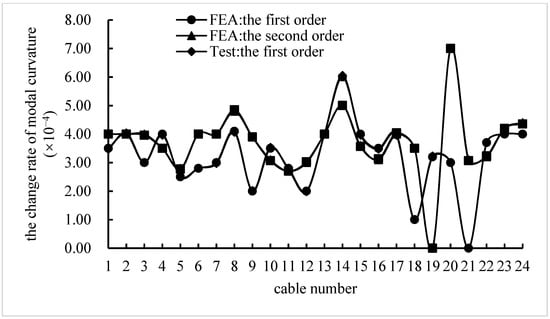 The damage diagnosis model for cable-stayed bridges established in this paper was used to diagnose the damage of the side span cables of the Bridge under the nondestructive state according to the process in Section 4.2. The change rate of modal curvature is shown in Figure 10.