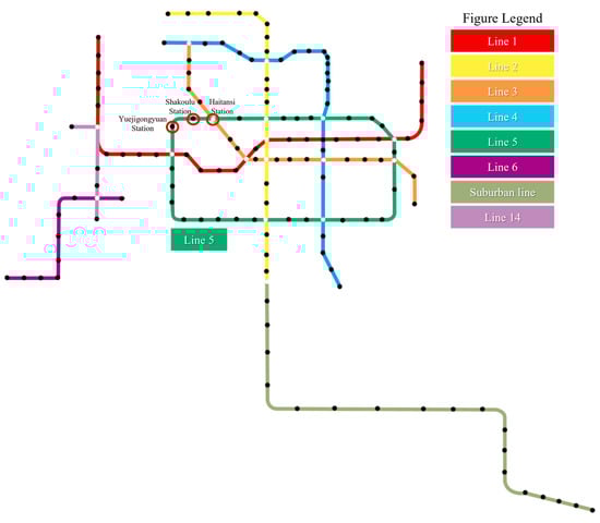 By 2021, Henan Province had a population of 98.83 million [] and Zhengzhou City had a population of 12.74 million []. At present, Zhengzhou has 8 metro lines, with the busiest being Line 5—a 40.7km ring around the city center with Yuejigongyuan Station as its first and last station []. It carried an estimated 300,000 passengers daily, followed by Lines 1 and 2. The operational map of Zhengzhou metro is shown in Figure 1.