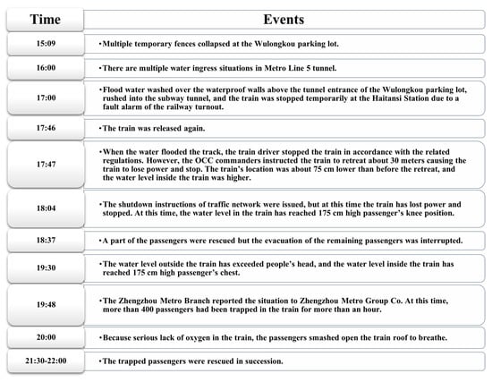 From 17–23 July 2021, Henan Province was hit by severe rainfall, resulting in extensive urban flooding. The disaster resulted in 398 reported deaths, with 380 in Zhengzhou. On 20 July, Zhengzhou suffered major casualties and economic losses, including the Zhengzhou Metro accident that caused 14 fatalities. Between 17:00 and 18:00, Metro Line 5 was traveling from Haitansi Station to Shakoulu Station when floodwater rushed into the metro tunnel from the Wulongkou parking lot, a stop and maintenance area for metro trains. This caused over 900 commuters to be trapped, with more than 400 of them detained for over three hours. A map of the accident site and the Wulongkou parking lot is shown in Figure 2, and a summary of the accident is provided in Figure 3. The information is derived from the “Investigation Report on the ‘7·20’ Extraordinary Rainstorm Disaster in Zhengzhou, Henan Province” published by the State Council Disaster Investigation Team of the Ministry of Emergency Management of the People’s Republic of China (MEM) [], as well as relevant information compiled by The Paper News [].